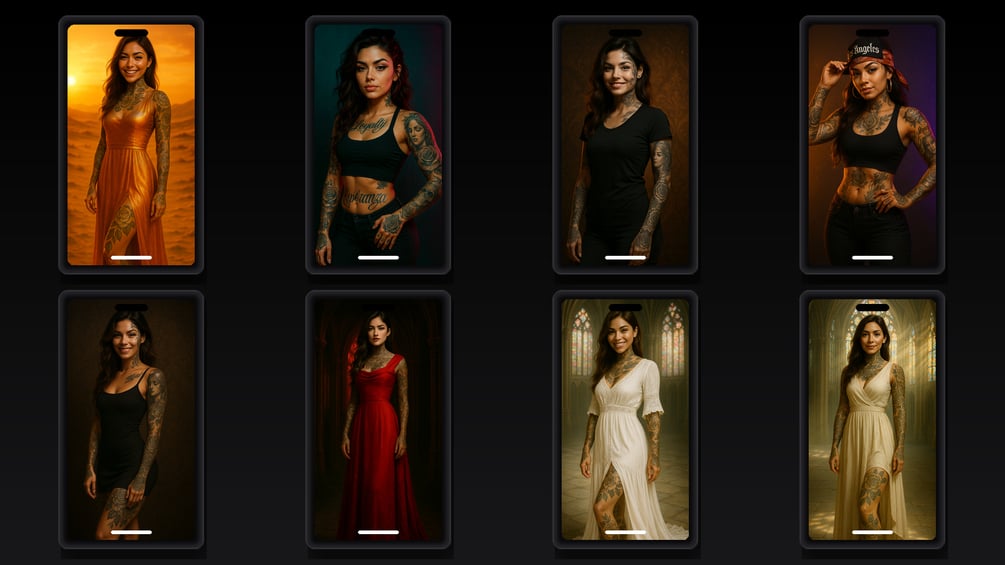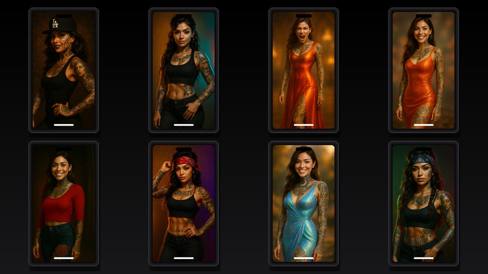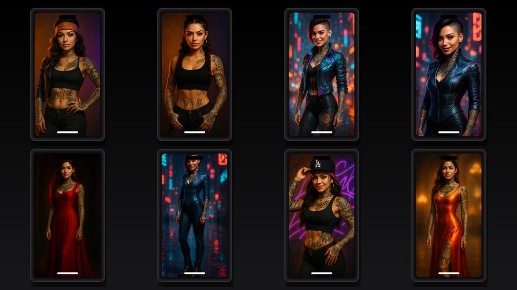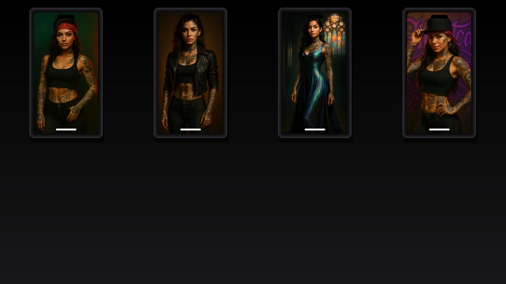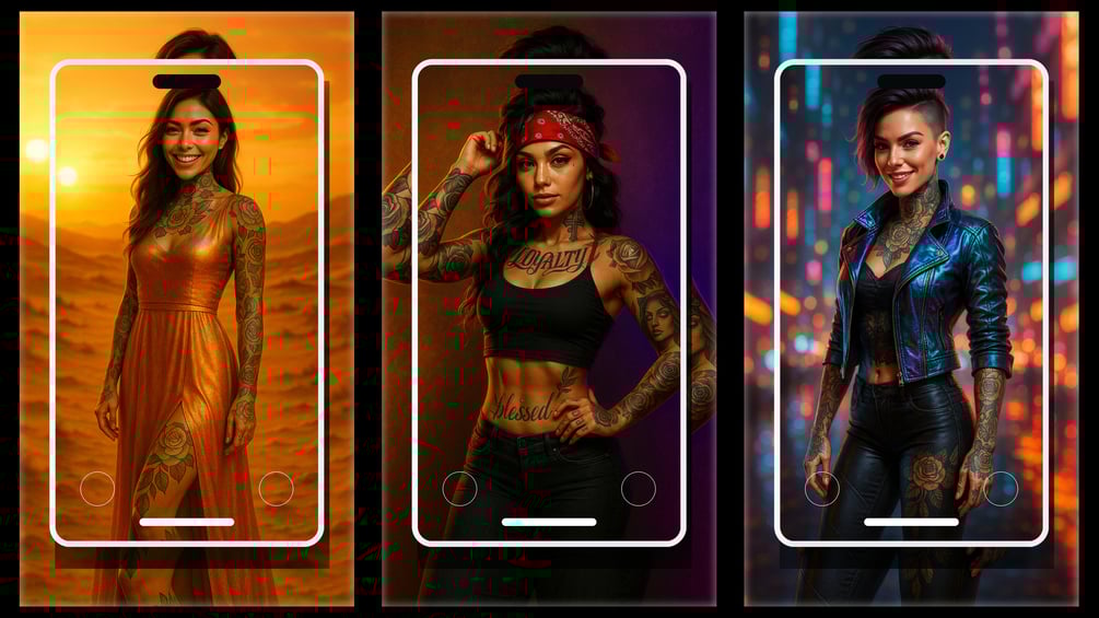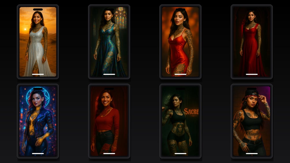 This exclusive set features 36 hyper-realistic tattooed women — from modern Chicano queens to elegant muses wrapped in light and color.